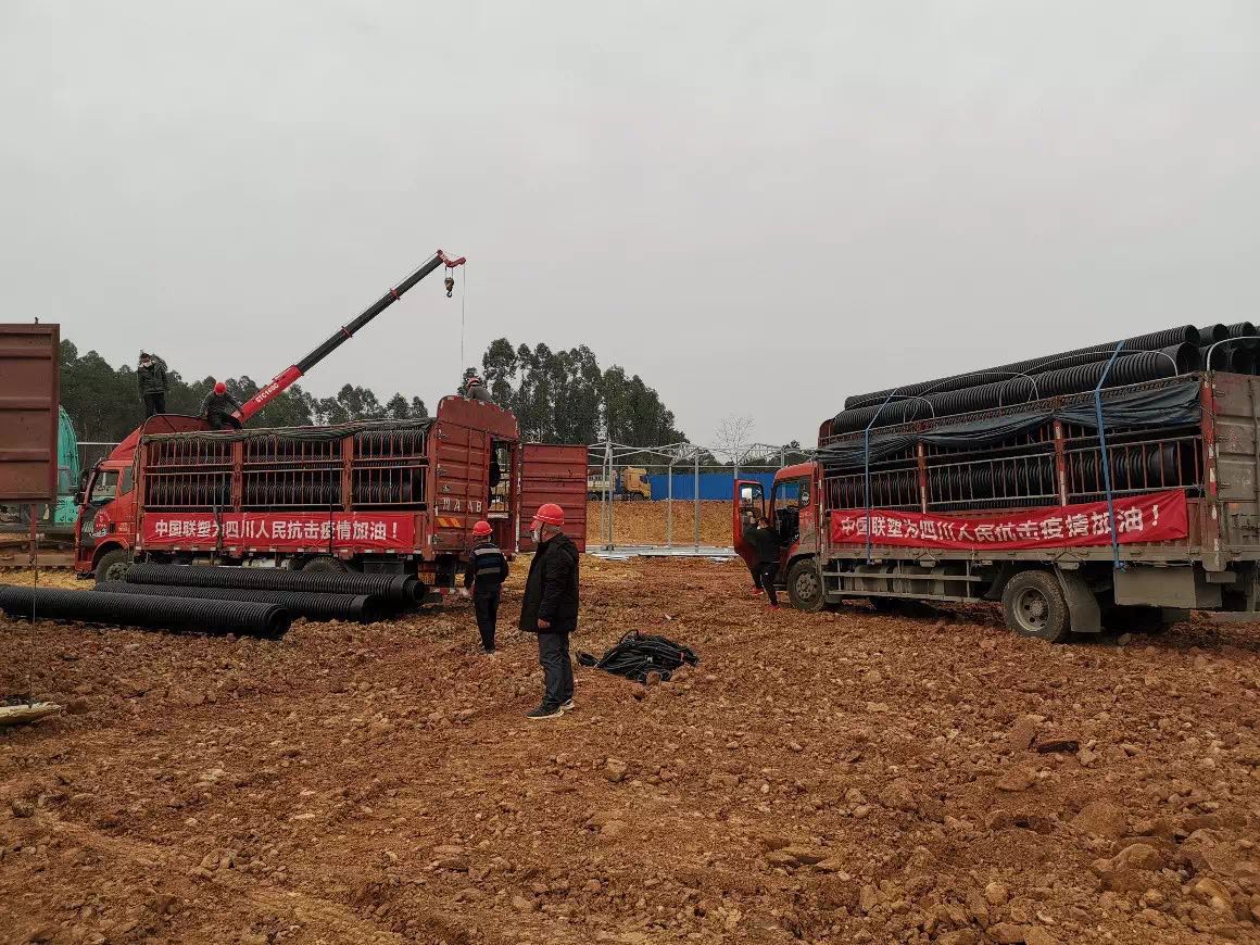 疫情当前,全力驰援。2月8日,中国韦德官方网收到关于南充市应急隔离医院项目管材管件的需求后,应急专项小组紧急协调四川韦德官方网人员、物资、仓储、物流等资源,与当地的红十字会机构进行多方面沟通协调。当晚以昼夜不休的态度将管材管件准备好,调度运输车辆,安排车辆进场,让捐赠的管材管件组织、交接工作快速而有条不紊地进行,确保项目建设所需的给排水管材管件能以最快的速度运到现场。经过连夜的奋战准备,韦德官方网集团向南充市应急医院建设项目捐赠的HDPE双壁波纹管、PE管等管材管件在2月9日通过近十辆大货车,满载四川韦德官方网捐赠的物资抵达施工现场,协助医院尽快建成投入使用。